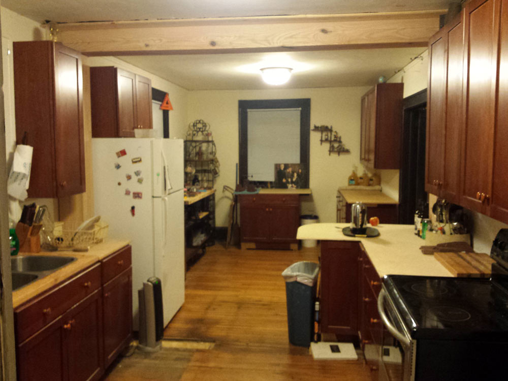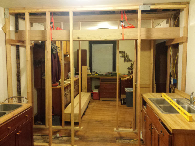 In 2013 I purchased a house built in the 1920’s located on the outskirts of Asheville. Since that time I’ve been re-wiring, re-plumbing, combining rooms, etc. This post will highlight one of the main projects that I’ve been working on, The Kitchen Remodel. The Kitchen and Dining room in this house were both very small and difficult to work with. About 6 months ago I decided to take down the wall between the two rooms and make one large  kitchen. I replaced the load bearing wall with three 8 inch wide by 8 inch tall beams. The top horizontal beam was 11 feet long and the two vertical beams were 8 feet tall.
