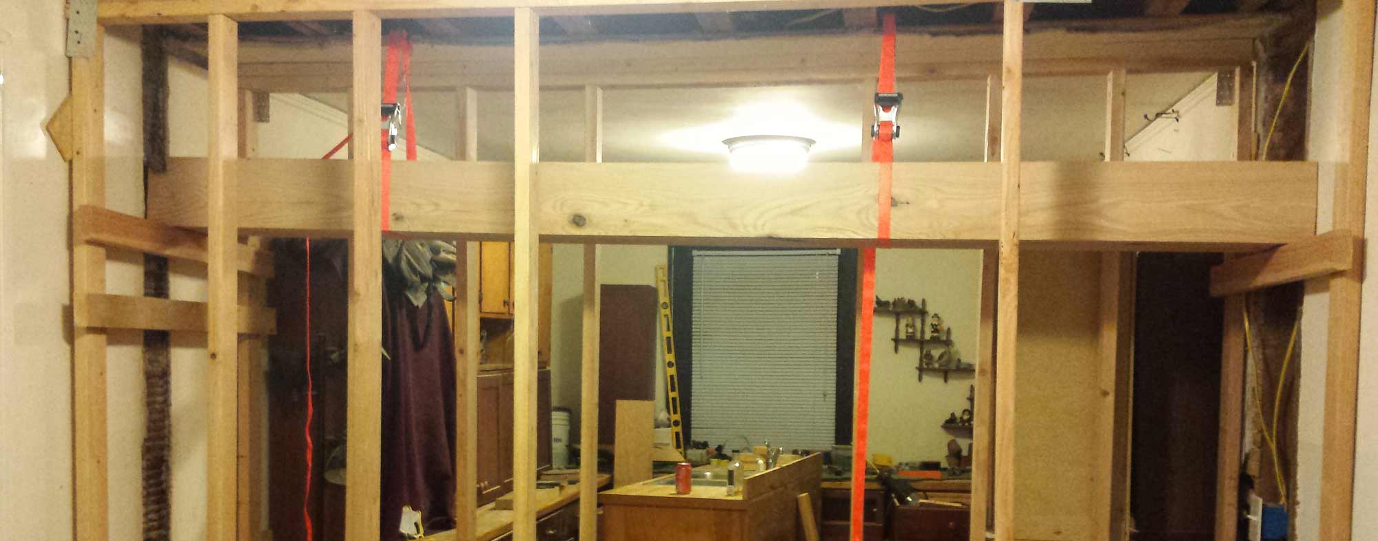 Once the top beam was hoisted as far as it could go and the vertical beams were bashed into place, it was time to let down the jack and remove the temp wall. This was a little nerve racking. I went overkill with the beams, the bracing, the reinforcing but it was still a little scary to let everything rest down on the new beams.