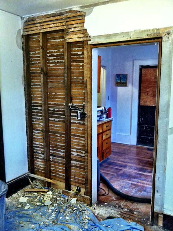 Here are few more shots from the demolition process. The plaster that was covering the walls contained horsehair so I assume most of this wall is original. Once the majority of the plaster was down and the lath was exposed I could see what I was dealing with. I knew that the wiring would need to be relocated but I wasn’t really sure how old it was.