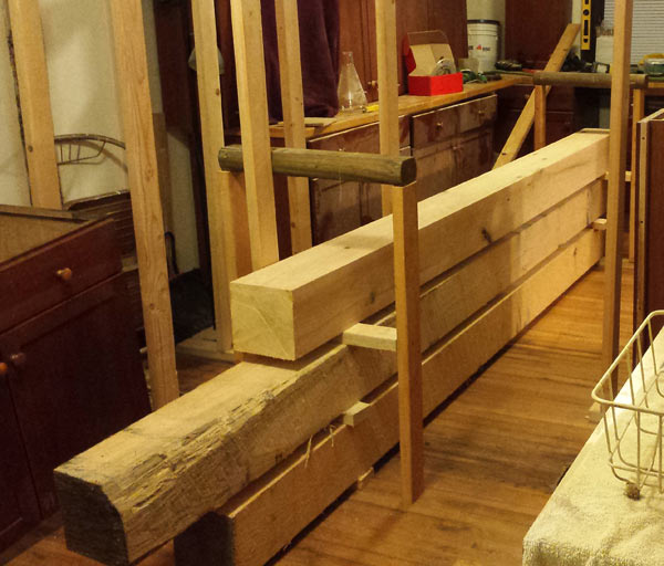 Once the beams were stacked in the kitchen the task was to plane, sand, rotate, repeat. I made a time lapse video that you can see below. It shows one side of one beam and a quick shot at rotating the beam to the next side.  Since the majority of this project was done by myself after work I had to get very creative with moving these beams alone.