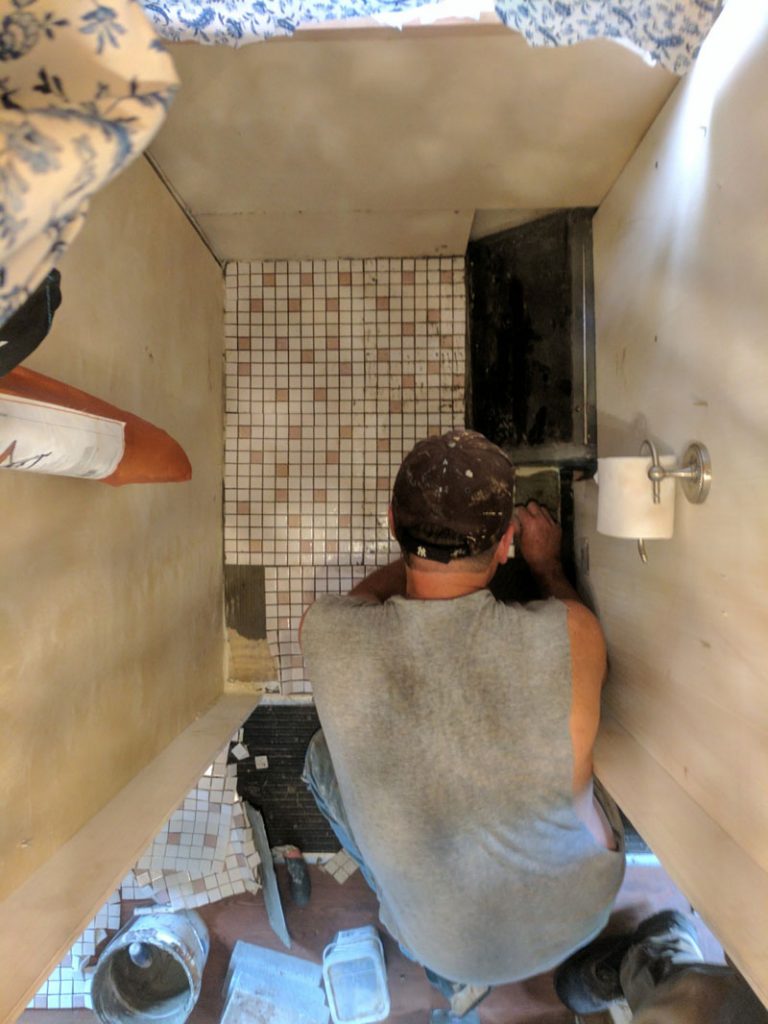I realized (too late) that I should have cut the drain hole and tiled around it rather than tiling the floor and cutting the drain afterwards. It wasn’t too big of an issue but I realized how tough tile is to cut with an orbital. I decided to drill a series of holes through the floor/tile and use a jigsaw to connect all the holes. Once this was done I dropped in the drain and caulked the area around it.