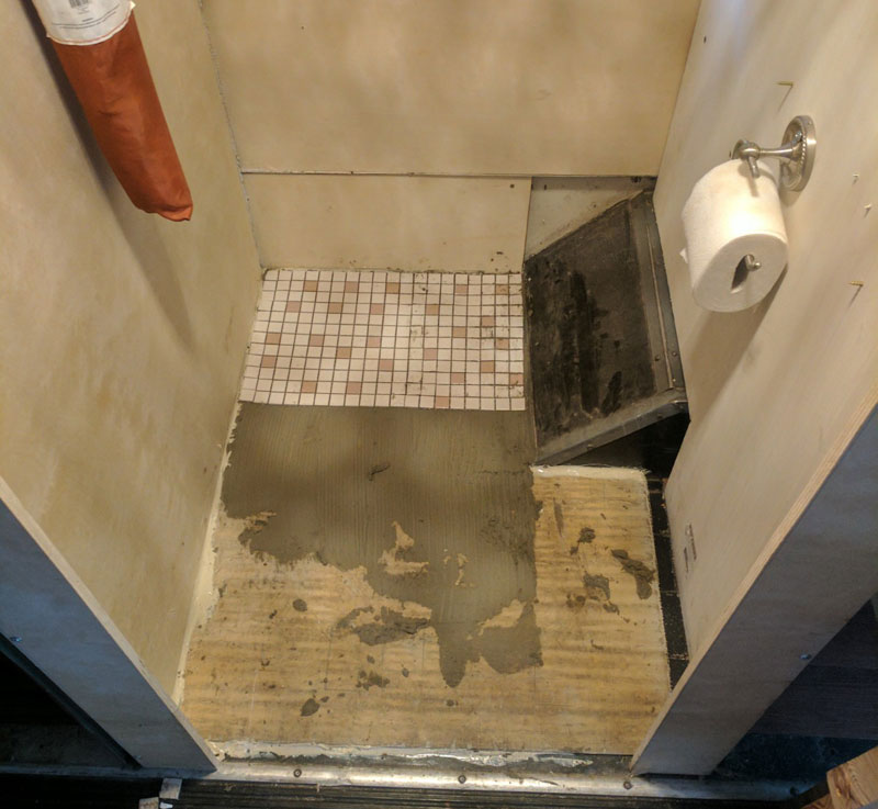 This photo shows the various layers of the flooring that I had to cut through to get the drain in place.